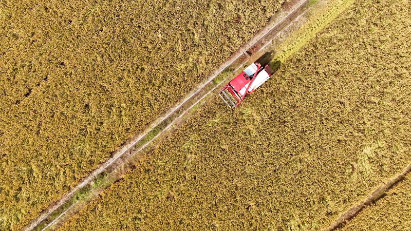 糯稻基地里稻浪翻滾,滿目金黃,田間地頭彌漫著稻谷的清香。“好糧釀好酒,好酒是種出來的,浙農-會稽山糯稻基地開鐮節正式啟動!”隨著領導嘉賓鏗鏘的號令,現場一字排開的多臺收割機發動引擎,在金色的稻浪中向前運作收割。稻田上空還有2架小型無人機拉著寫有“好酒是種出來的”字樣的橫幅來回飛翔。