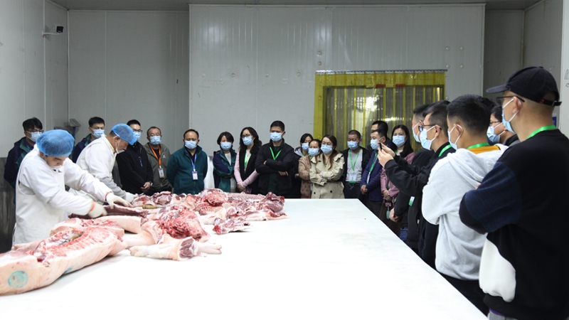 在豬肉分割車間,督查組成員現(xiàn)場觀看了工作人員剔骨、切塊、修整等規(guī)范操作,并聽取了關(guān)于豬肉品質(zhì)管控、分割質(zhì)量把控、食品安全規(guī)范及設(shè)施設(shè)備提升等情況的介紹。
