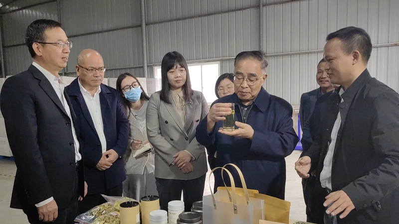 在基地內(nèi),張伯禮院士深入了解了杭白菊種苗的育苗過(guò)程、標(biāo)準(zhǔn)化生產(chǎn)流程,以及杭白菊健康種苗的繁育技術(shù)及應(yīng)用情況,對(duì)浙農(nóng)“標(biāo)準(zhǔn)化種植、全產(chǎn)業(yè)鏈發(fā)展”思路下“規(guī)范化基地+共享車間+農(nóng)事服務(wù)”的模式以及栽培技術(shù)和產(chǎn)品品質(zhì)給予充分肯定。因執(zhí)行統(tǒng)一技術(shù)標(biāo)準(zhǔn)和生產(chǎn)質(zhì)量追溯體系,種植全過(guò)程的安全可靠可追溯得到有力保障,基地的杭白菊在中藥材市場(chǎng)上得到了更多認(rèn)可,得知目前基地菊花畝產(chǎn)值達(dá)到1萬(wàn)余元,還能帶動(dòng)周邊村民致富,張伯禮院士稱贊其經(jīng)濟(jì)效益高,是名副其實(shí)的“共富花”。
