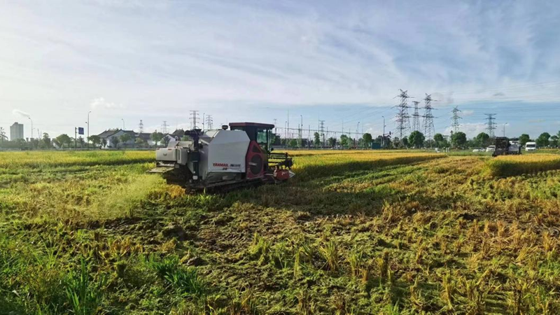 走進臺州市椒江區洪家場浦綠廊示范區,處處彌漫著稻谷的清香。沉甸甸的水稻彎下了腰,微風吹過,一陣陣稻海輕輕搖動,泛起了層層波浪;田間收割機來回穿梭,將粒粒飽滿的水稻盡數收入“囊中”。這是由浙農科技承接運營的椒江區洪家街道等四個街道全域土地綜合整治項目一期示范區內的豐收景象。