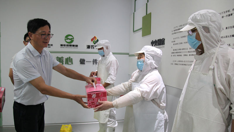 在浙農(nóng)華盛期間,曹勇奇還聽取了公司經(jīng)濟(jì)指標(biāo)、重點項目和重點工作完成情況匯報,并深入配送場地、中央廚房以及相關(guān)部門,看望慰問奮戰(zhàn)在高溫一線的干部職工,為他們送上防暑降溫用品。