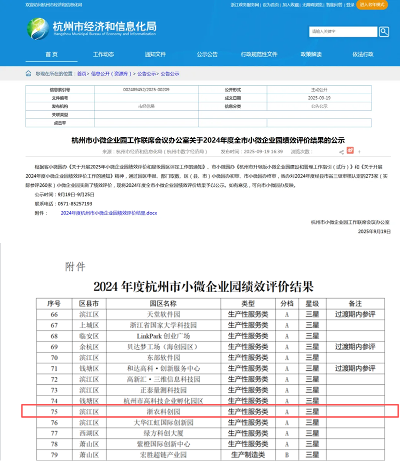 近日,杭州市小微企業園工作聯席會議辦公室公布2024年度小微企業園績效評價結果,浙農科創園再次獲得三星A檔績效評價。
